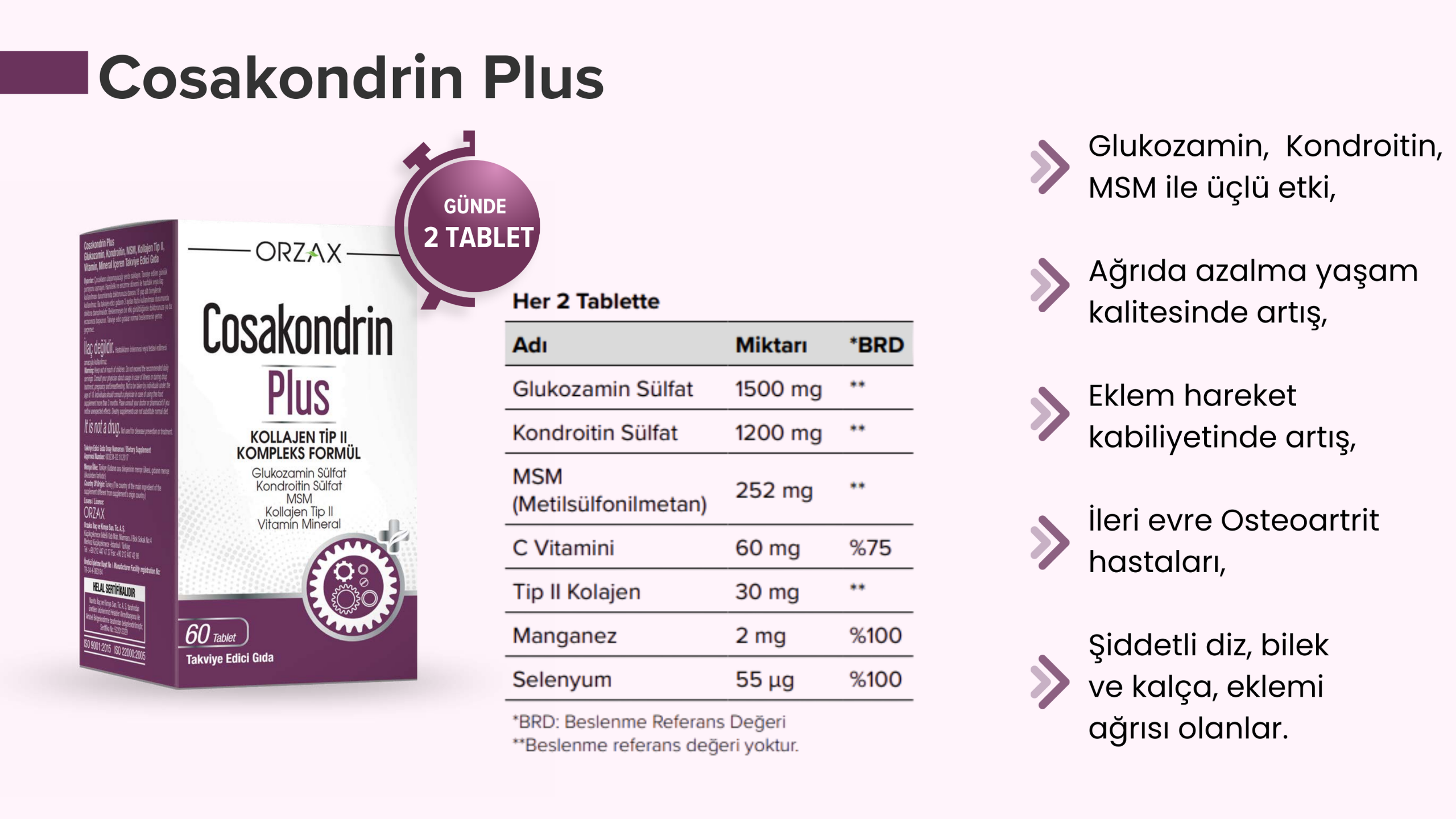 Cosakondrin Plus 60 Tablet glukozamin, kondroitin, MSM ve kolajen ile eklem ve kıkırdak sağlığını destekler. Cosakondrin Jel 100 ml ise bitkisel içerikleriyle kas ve eklem bölgelerine rahatlama sağlar.